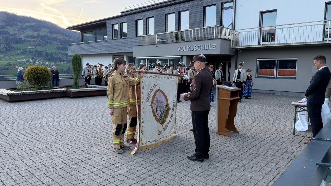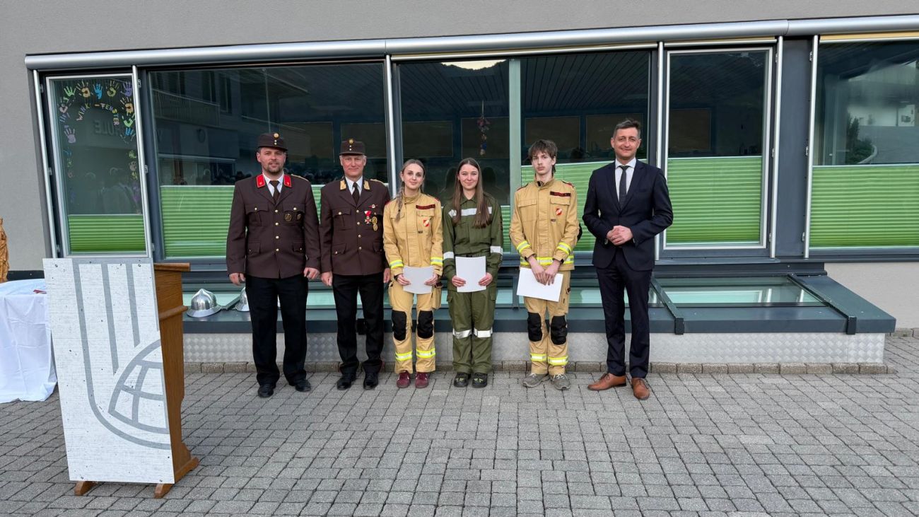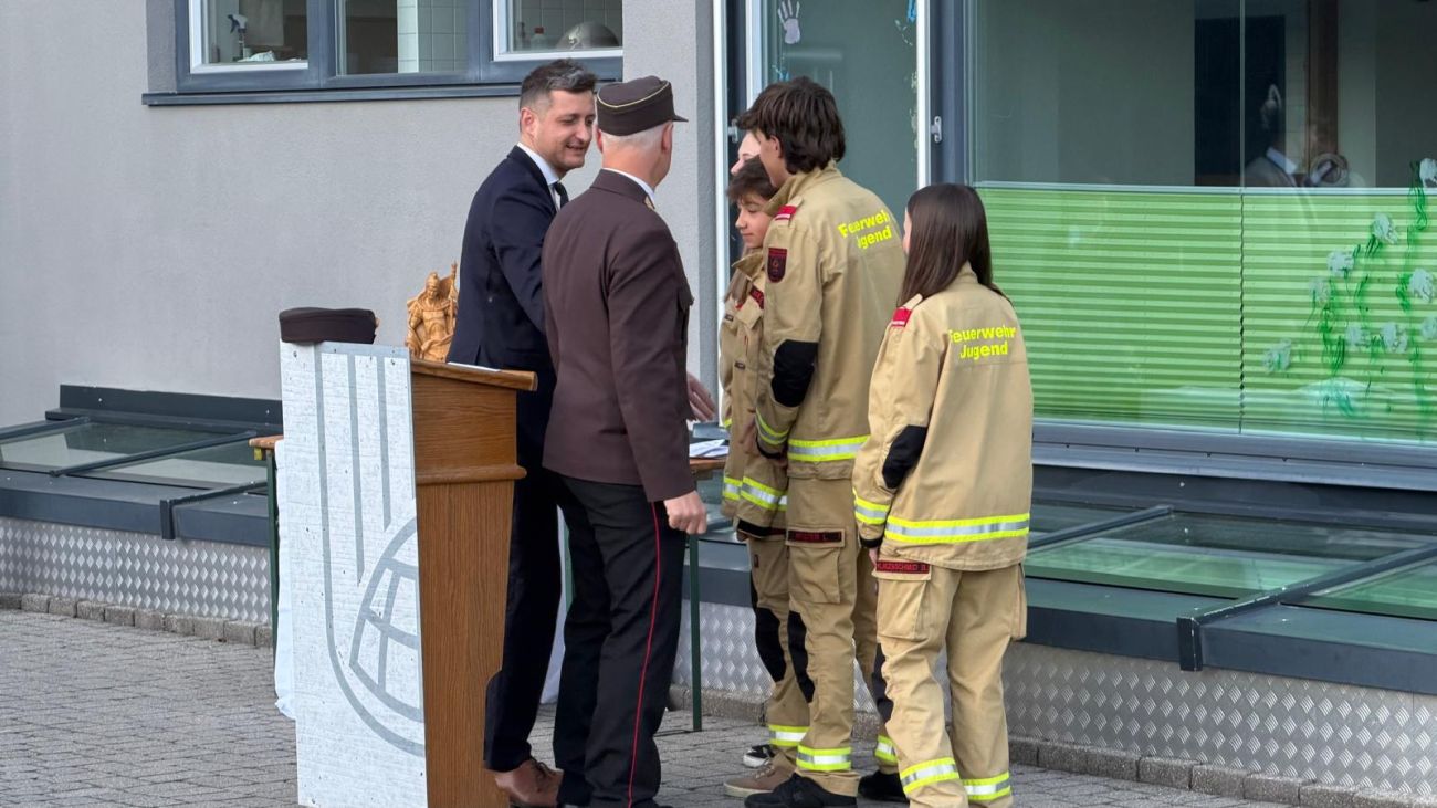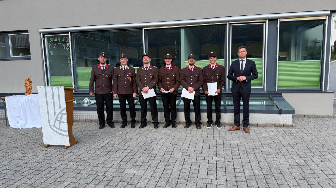 Im Anschluss daran fand am Vorplatz der Volksschule Hart der Festakt statt. Dabei wurden drei neue Kameradinnen und Kameraden angelobt und somit offiziell in den Dienst der Feuerwehr aufgenommen. Zudem durften wir mehrere Ehrungen für verdiente Mitglieder durchführen.