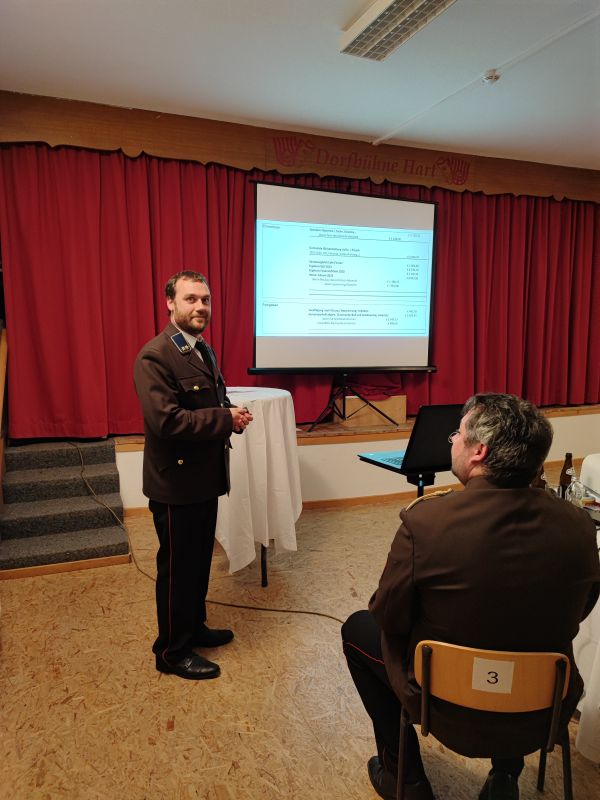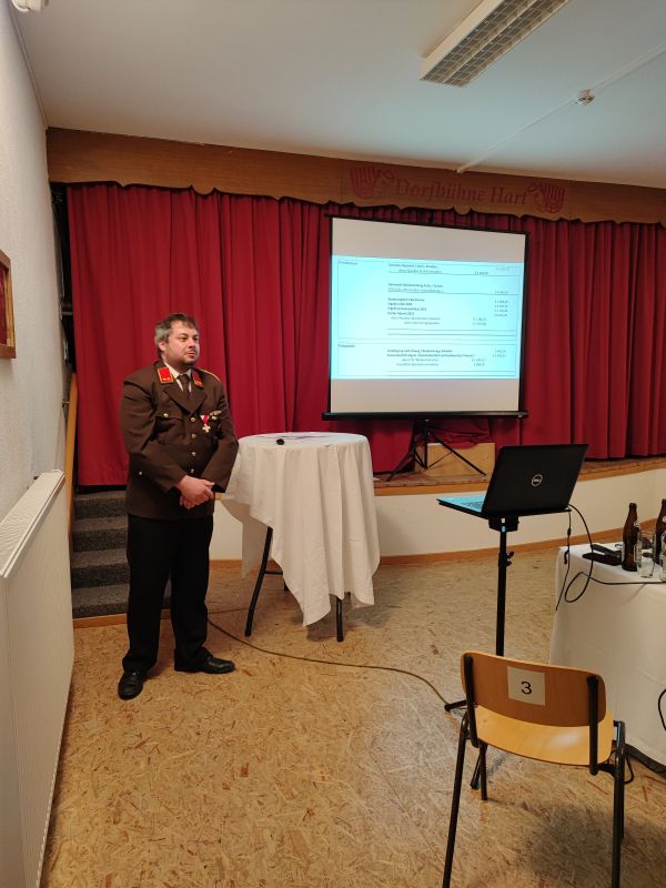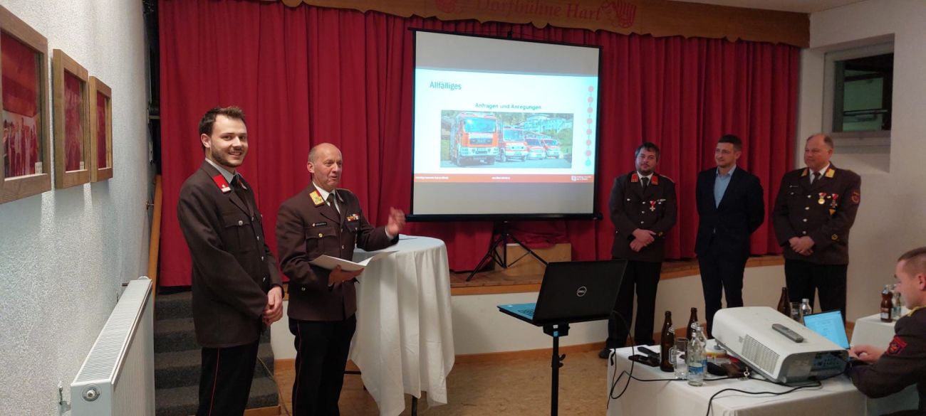 Kommandant Patrik Nail begrüßte um 19:00 im Theatersaal Hart die anwesenden Feuerwehrkameradinnen und Kameraden sowie alle Ehrengäste. Neben Bürgermeister Daniel Schweinberger folgten Bezirkskommandant OBR Hansjörg Eberharter, Abschnittskommandant ABI Reinhard Haun, Ehrenmitglied ABI Gerhard Gruber und mehrere Wirtschaftsvertreter der Einladung. Nach der offiziellen Begrüßung folgte eine Schweigeminute für alle verstorbenen Feuerwehrkameradinnen und Kameraden. Es konnte auf ein einsatzreiches Jahr zurückgeblickt werden. Besonderes zu erwähnen sind die zahlreichen Sturmeinsätze im Sommer die unsere Gemeinde stark getroffen haben.
